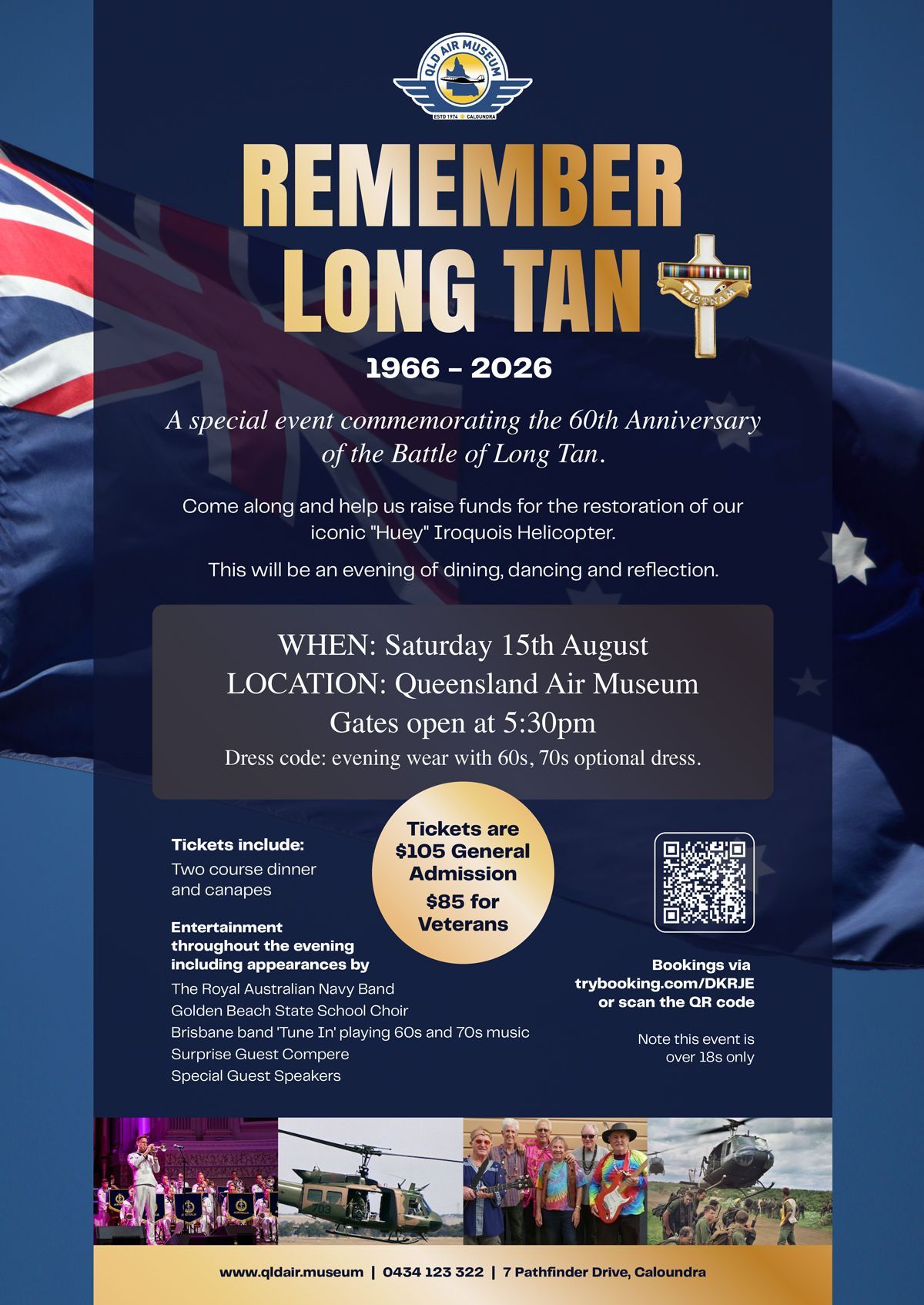 Join us for an evening of dining, dancing and reflection, to help us raise funds for the Museum, in particular the restoration of our iconic 'Huey' Iroquois Helicopter.